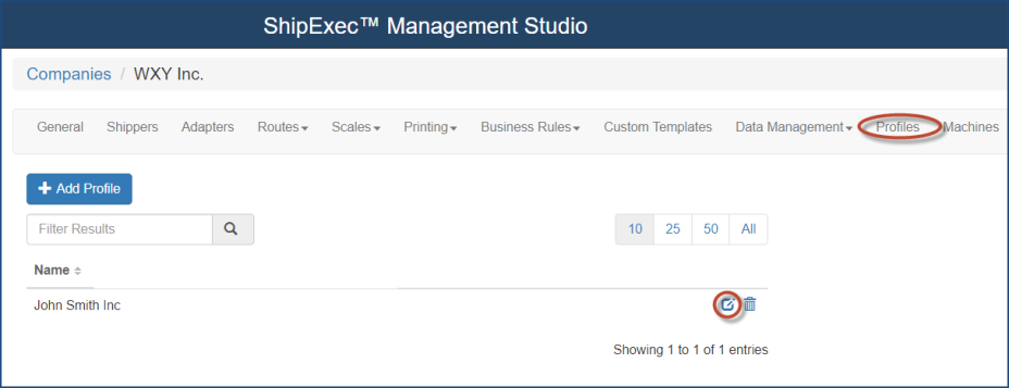 • To remove a pickup configuration for a profile at the company level, click the icon for the company for which you want to remove a pickup configuration.